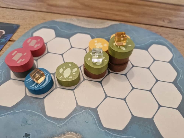 Green represents a tree. This scores one, three, or seven points depending on its height. When you want to make a tree taller, you first play brown, the trunk, once or twice. When you place a green stone directly on the board, this tree can no longer grow. This is because you never place stones under an already placed stone, only on top of it.
