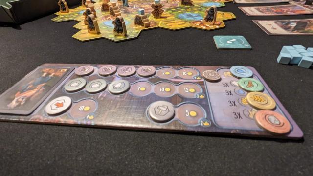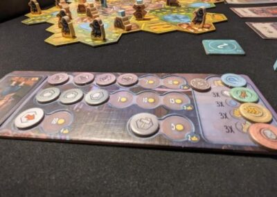 Once you have completed all your actions and turned over all your action tokens, they can only be reversed and used again in the next turn. By walking back to the city (tiles in the middle) you can sell resources in the middle and learn and train new skills around the middle to increase your action possibilities. To train/gain new skills, pay for the resources, and place a cube of your color on the field above. Here you can also grab victory points. Also with this game, whoever has the most points wins.