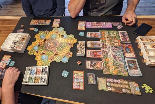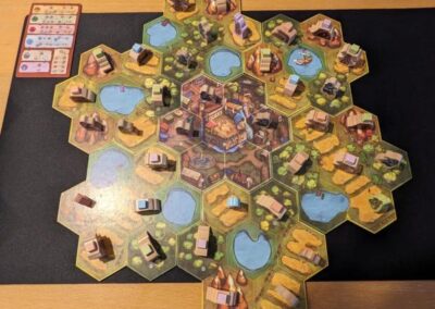 Bij het lezen van de handleiding was ik erg enthousiast. Maar tijdens het spelen met 2 spelers kwamen we er al achter dat er wat issues zijn met dit spel. Doordat het artwork zo mooi is, is het mega onoverzichtelijk. Doordat er geen primaire kleuren zijn gebruikt maar pastelkleuren is het moeilijk te zien en dat is een belemmering met spelen. Zeker bij de inkomstenfase is het niet fijn. Dit werd nog eens extra bevestigd toen we het met 4 spelers gingen spelen (ik en nieuwe mensen die het spel nog nooit gespeeld hadden).
