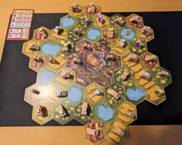 Als je al je acties hebt uitgevoerd en al je actietokens dus hebt omgedraaid kunnen deze pas weer in de volgende beurt worden omgedraaid en weer worden gebruikt. Door naar de stad terug te lopen (tegels in het midden) kan je in het midden grondstoffen verkopen en rondom het midden nieuwe vaardigheden leren en trainen om je actie mogelijkheden te vergroten. Om te trainen / nieuwe vaardigheden te kunnen doen, betaal je de grondstoffen en leg je een blokje van jouw kleur neer op het veld daar boven. Hier kun je ook overwinningspunten pakken. Ook met dit spel is het zo, wie de meeste punten heeft, heeft gewonnen.