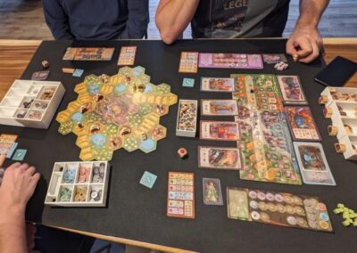 When reading the manual, I was very excited. But while playing with 2 players, we already found out that there are some issues with this game. Because the artwork is so beautiful, it is mega cluttered. Because no primary colors are used but pastel colors, it is difficult to see and that is an obstacle to playing. Especially at the income phase, it’s not nice. This was further confirmed when we started playing it with 4 players (me and new people who had never played the game before).