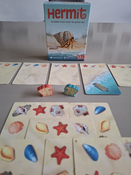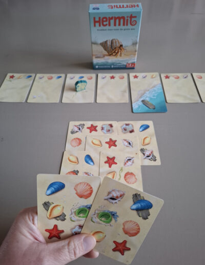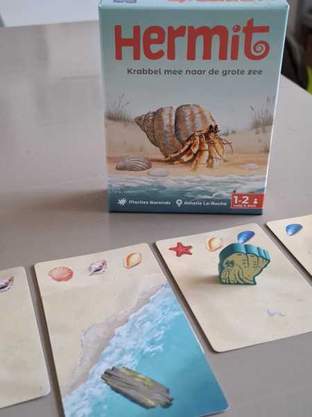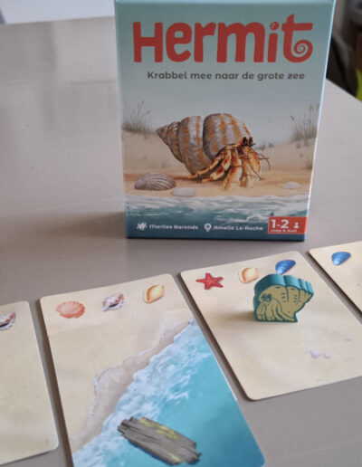 Hermit is een klein, kort kaartspelletje waarbij je probeert om Hermit, de heremietkreeft, terug naar zee te krijgen. Lukt jou dat (als eerste) vooraleer de zee zich helemaal terugtrekt? Dan win je Hermit!