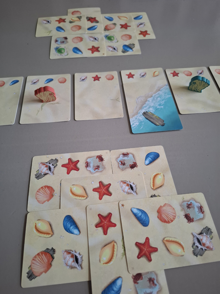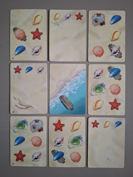 Depending on the choice you make to play, the starting setup is slightly different. I will explain the game here using the solo variant. The beach cards have two sides: one side (called the beach side) has a piece of beach and three shells/starfish at the top, the other side (called the shell side) has six boxes containing a shell or starfish (with or without driftwood) or a puddle, a cap or a piece of beach.