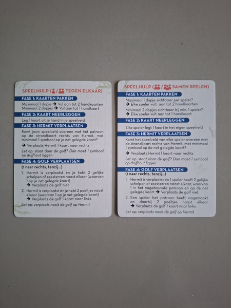 You can make the game more difficult by turning the wave card over. Then it shows 2 pieces of driftwood. The aim is then, in the last step of Hermit, to have 2 shells/starfish on driftwood in the pattern instead of 1. Not easy. Another way to make it more difficult is to place the wave card on beach card 7 or 8 instead of beach card 6 at the start of the game. Personally, I prefer the additional challenges to make the game more difficult than the options mentioned above. Challenges could include not having any visible caps when you take the winning step with your Hermit, or not being allowed to place cards next to each other (so always cover at least one corner of a card underneath).