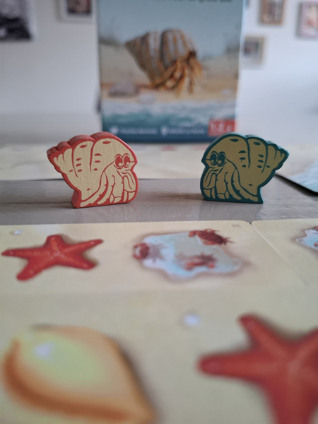 Moving Hermit: If you have managed to replicate the pattern on the next beach card in the row and at least 1 of the shells/starfish in the pattern is on the card you just placed, you may move Hermit 1 space to the right. If the wave card is on the beach card to which you want to move Hermit, at least one symbol from the pattern must be depicted on a piece of driftwood. If this is the case and you can move Hermit to the beach card with the wave, the game is over and you win immediately.