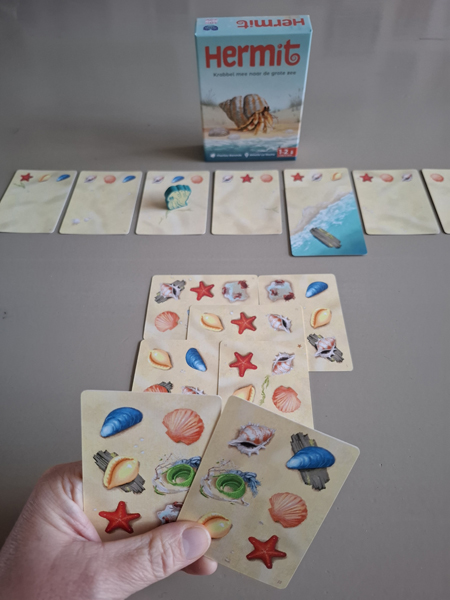 Hermit is a small, short card game in which you try to get Hermit, the hermit crab, back to the sea. Can you do it (first) before the sea recedes completely? Then you win Hermit!