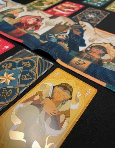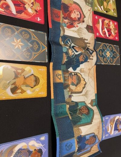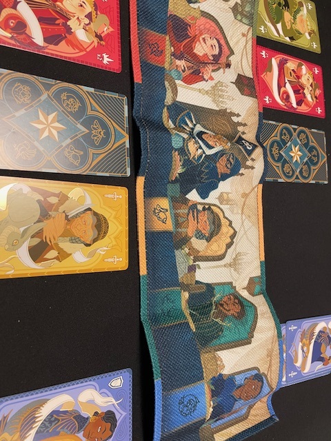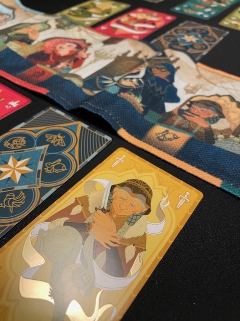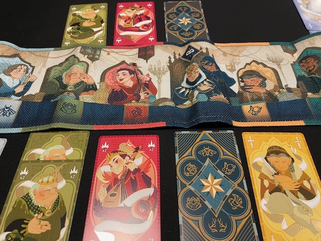 Het spel wordt geleverd in een vrij grote doos en bevat een set grote kaarten, eindbonuskaarten en een klein kleedje. De kaarten zien er prima uit. Het kleedje is van dun stof en wat rommelig, er zitten vouwen in en krult wat op. De print op het kleedje is niet van superkwaliteit. Voor mij had dit geen kleedje hoeven zijn, maar een langwerpig bordje.