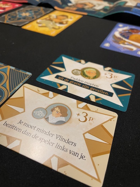 The game continues until the draw pile runs out. After each turn, players draw three new cards. At the end, the player determines which color has the majority at the top and which at the bottom of the table, i.e., which colors yield positive and which negative points. Then, the points in the players’ own territories are tallied. Finally, the player looks at their own objective cards and counts the extra points. The player with the most points wins the game.