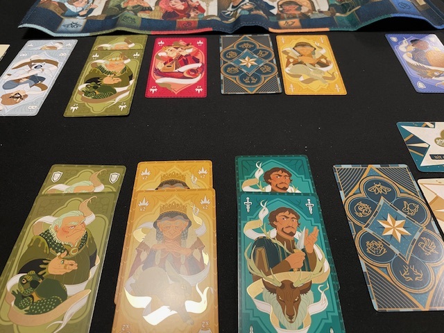 Each turn, a player plays three cards from their hand: one in their own territory, one on the table (the tablecloth), and one in an opponent’s territory. Cards in a player’s territory count as points. However, these points can be either positive or negative, depending on the ratio of cards of the same suit on the table. If there are more cards of a certain suit at the top of the table than at the bottom, that suit scores positive points for everyone who has that suit in their territory. This is called “High Value.” If there are more cards of a certain suit at the bottom of the table, this results in negative points (penalty points) for all players holding that suit. This is called “Out of Favor.”