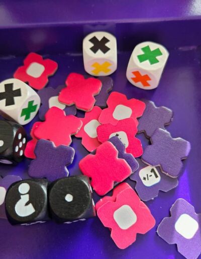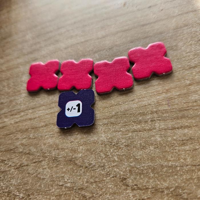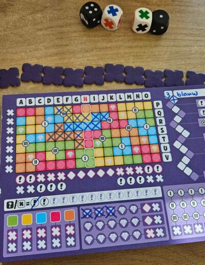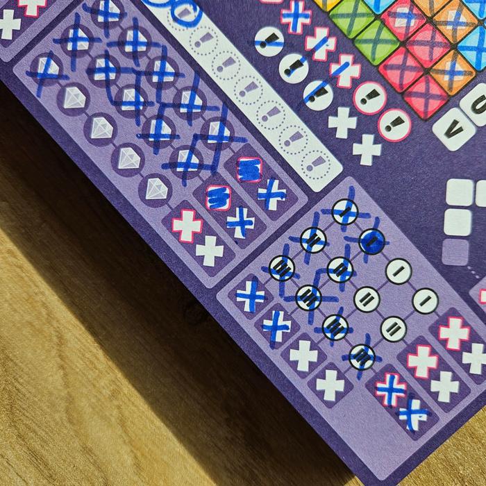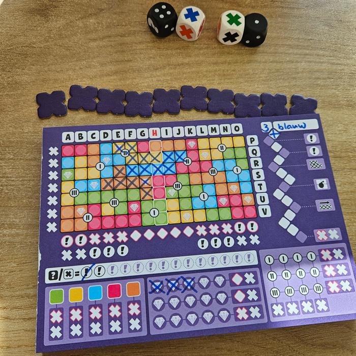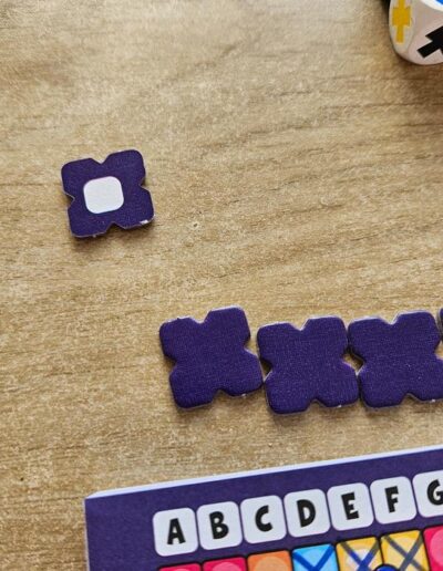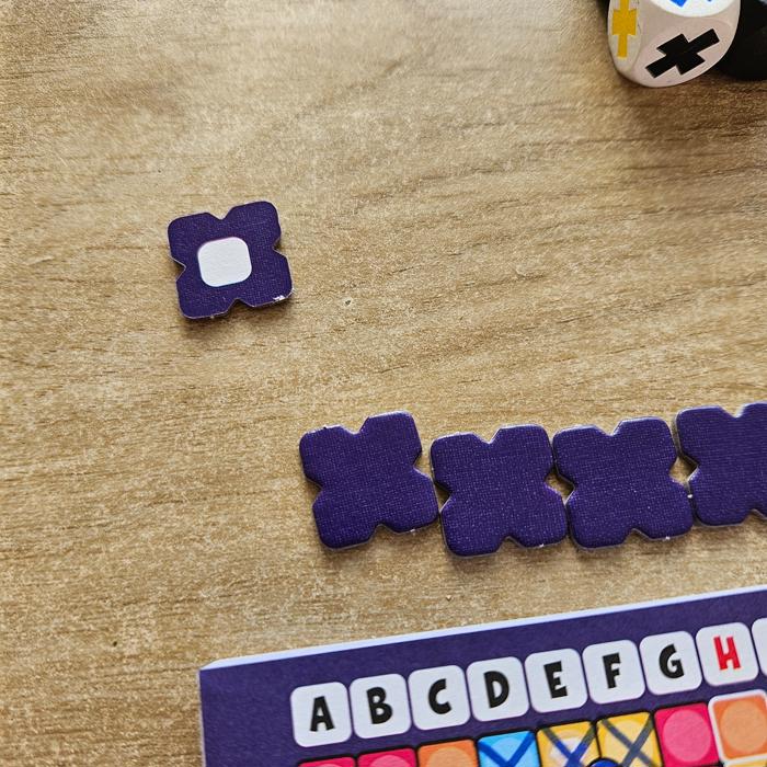 Each player starts with 10 X-tokens. Every time a player can cross off an X on their sheet, they may remove one X-token. But pay attention: the token must first be flipped over. Some of the tokens contain a bonus action on the back.