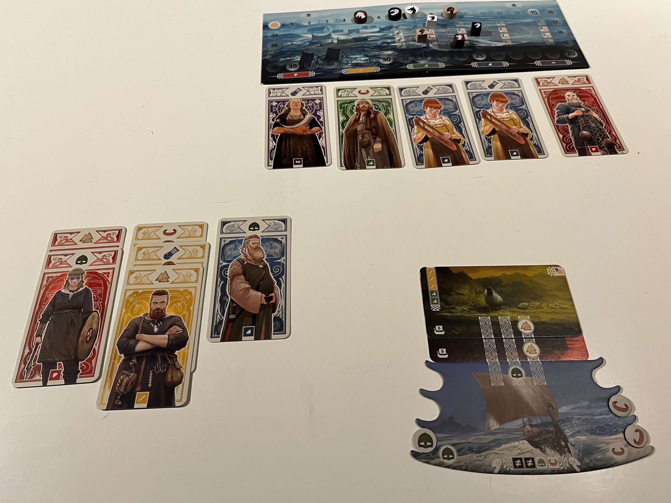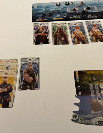 First and foremost, the game is a set-collection game with an open drafting system. You collect cards from an open market row to play into your own tableau. So, you try to manage your hand to add the right Viking to your crew at the right time. There’s also a slight race element to the game, as the first player to reach 40 points ends the game.