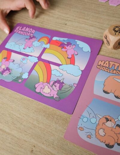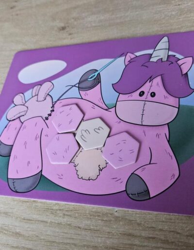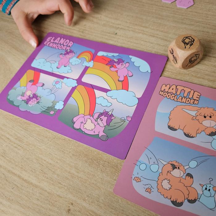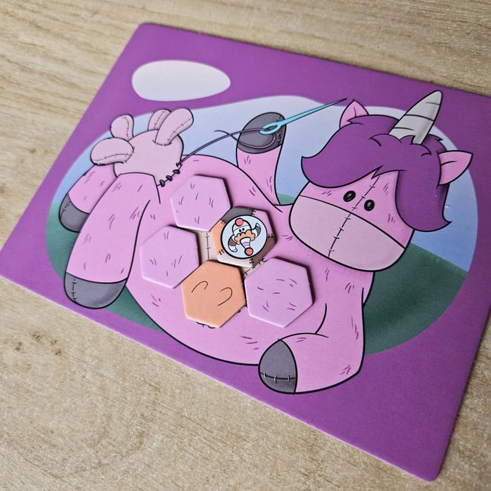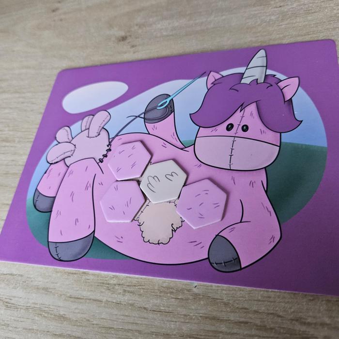 Once again: just look at it! Take a good look. Whether it’s a fun game or not, you’re guaranteed to fall in love with the artwork. It wasn’t until after the first game that I discovered that each cuddly toy actually has a name and its own story. On the back of the character cards there’s a small comic strip explaining how that particular character lost their patches. When Leonore found out that the unicorn (her favorite “animal”) was called Elanor, she was completely sold: this game was made for me!