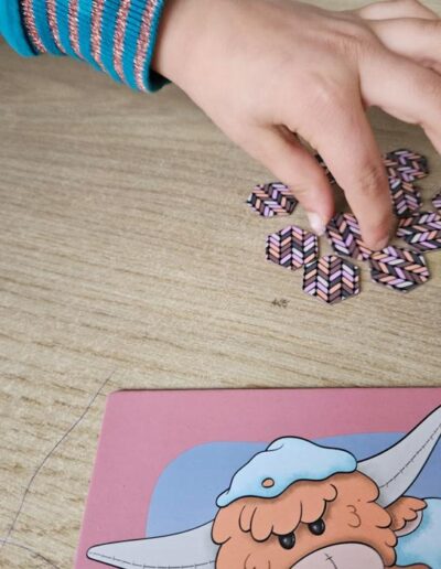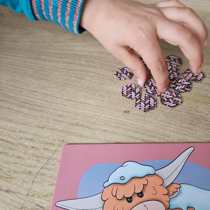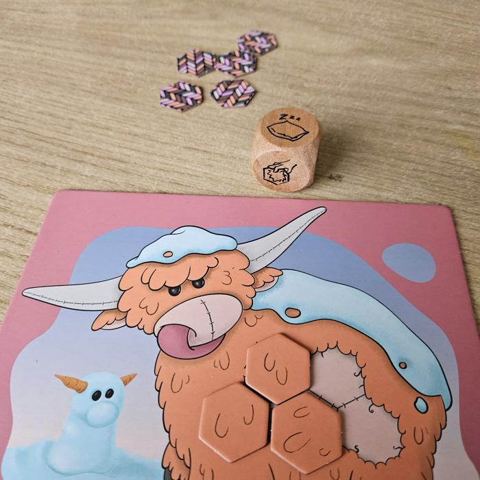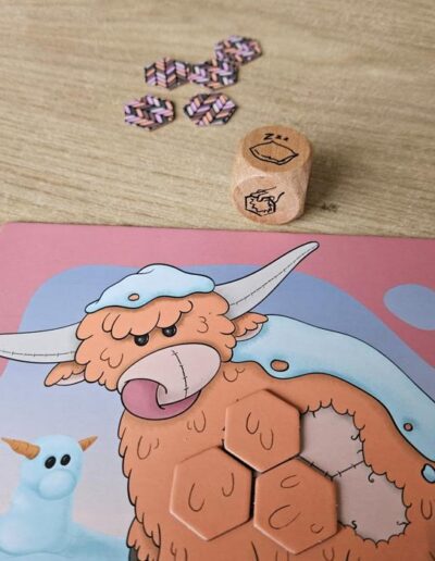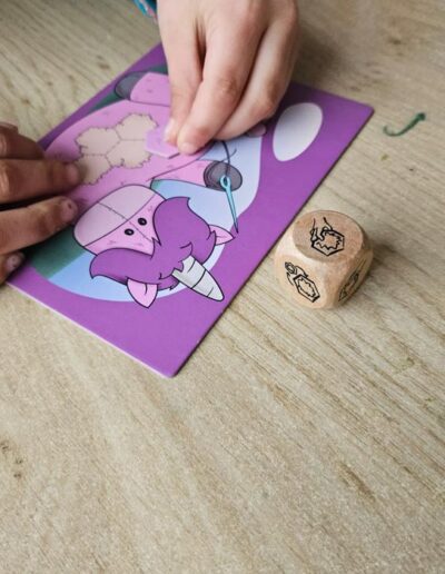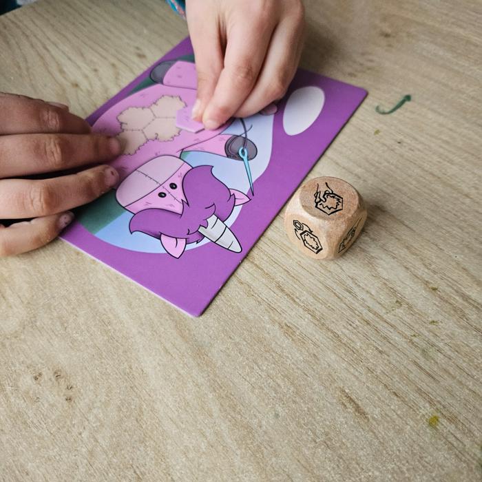 In my opinion, the die is well balanced: you don’t have to sleep very often, and “take a patch” appears most frequently. Of course, with a die you’re always dependent on what you roll, so it can happen that several rolls in a row don’t really change much in the game. I think the swapping option is a fun addition, especially because it’s optional. (The rulebook also mentions that you can choose to make swapping mandatory as a variant.) I myself tried to play “nicely” by not swapping when it didn’t benefit me directly, but Leonore had other ideas. When she rolled “swap,” she promptly stuck me with a color that wasn’t even in play anymore and took a patch of the correct color from me. A bit annoying… haha… but also very fun to see that she can already think that strategically at her age.