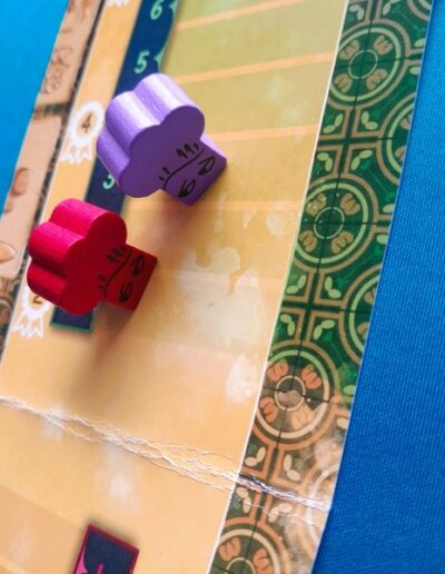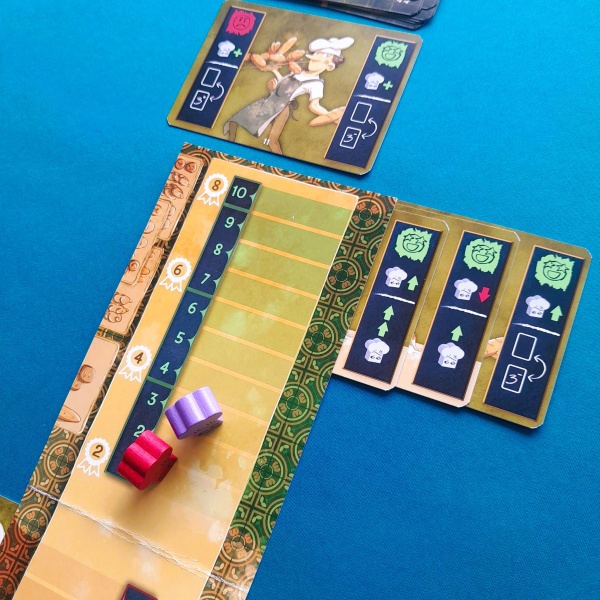 L’oaf is slightly different from the other games in this series. This game does not only contain cards. It also has meeples in the form of baker’s hats and a score track.