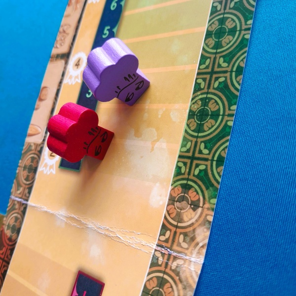De meeple wordt op het scorespoor geplaatst en de kaarten krijgt de speler in zijn hand.