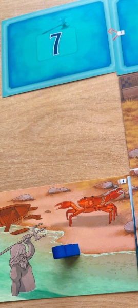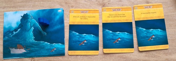 I was proven wrong: during my first game, I got completely stuck after almost an hour of playing. I couldn’t take any more actions. Had I overlooked something? I reread the booklet. Hmm… I had done everything right, hadn’t I? I read it again. And sure enough, because of the large number of examples and details, I had overlooked an essential rule, namely that when you place new scenery cards with an image of the hero on them, the meeple is placed there and you then explore this card (first). Oops! A good reason to play the game again later, so we can see if it’s replayable.