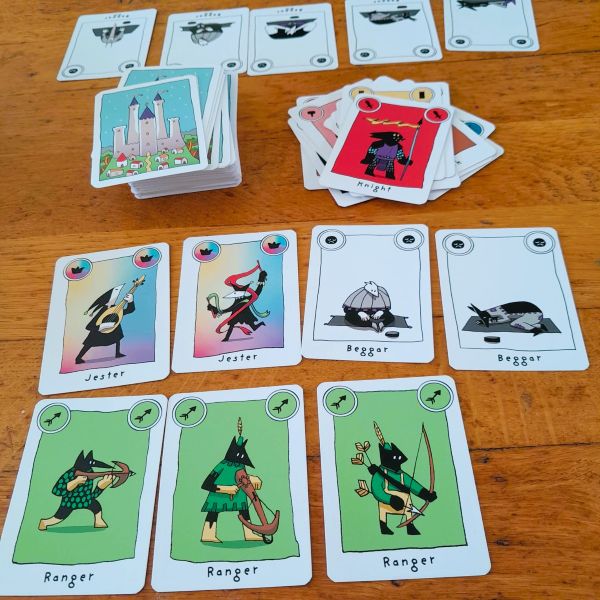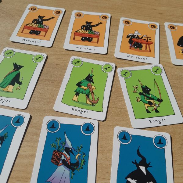 A guild consists of at least 3 cards of the same color (or in combination with the Jester). After playing the guild, the power of the character in question may also be activated.