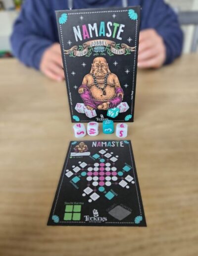 Namaste is een Roll & Write spel, waarbij je de geworpen punten slim moet invullen om punten te scoren. Maar pas op; wanneer je niet snel genoeg bent, kun je die punten op je buik schrijven. In Namaste moet je een balans vinden tussen snelheid en strategie.
