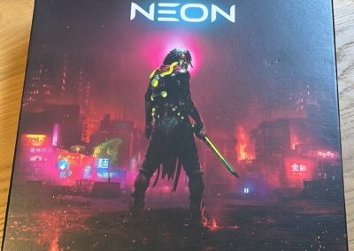Neon heeft een specifieke “cyber” stijl met veel, je raadt het al, neon kleuren. Deze stijl van illustraties en dooscover spreekt me heel weinig aan, om niet te zeggen “totaal niet”, maar ik ben blij dat dit me niet heeft tegengehouden het toch op tafel te brengen. Ondanks de stijl en het thema, was ik toch aangenaam verrast door het spel. Het spel speelt heel erg vlot en soepel wat ik heel positief vond, niet omdat het dan snel gedaan was. 😉