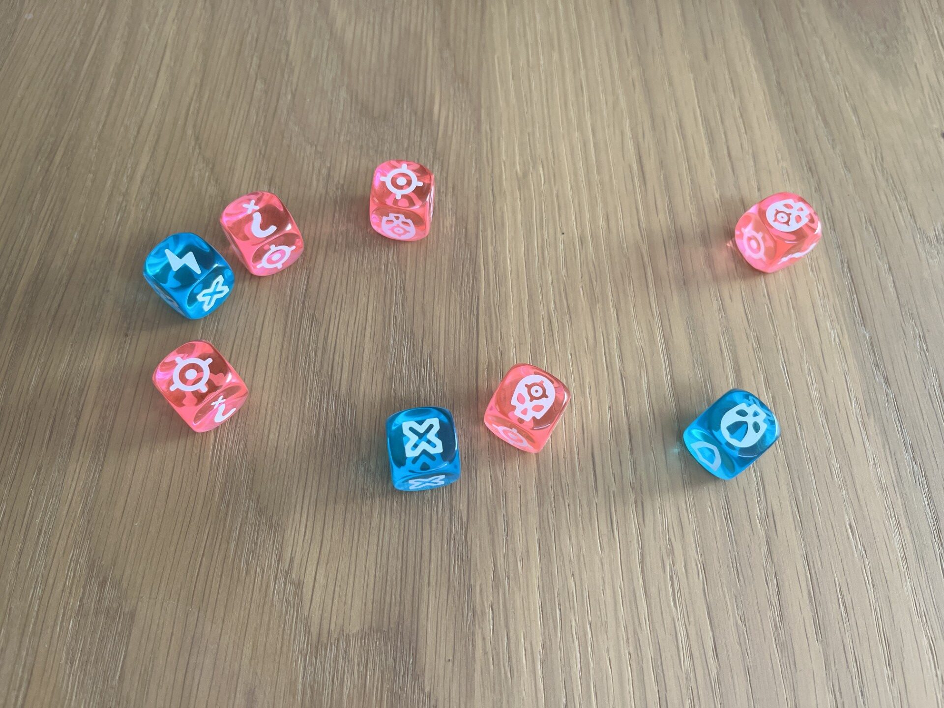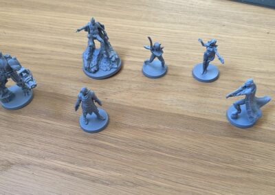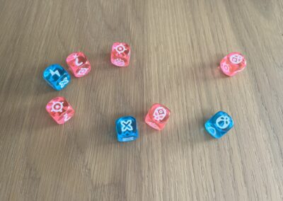 - De componenten en miniaturen zijn wel mooi uitgewerkt. De dobbelstenen passen volledig in het thema (neonkleuren) en de miniaturen zien er prachtig uit.