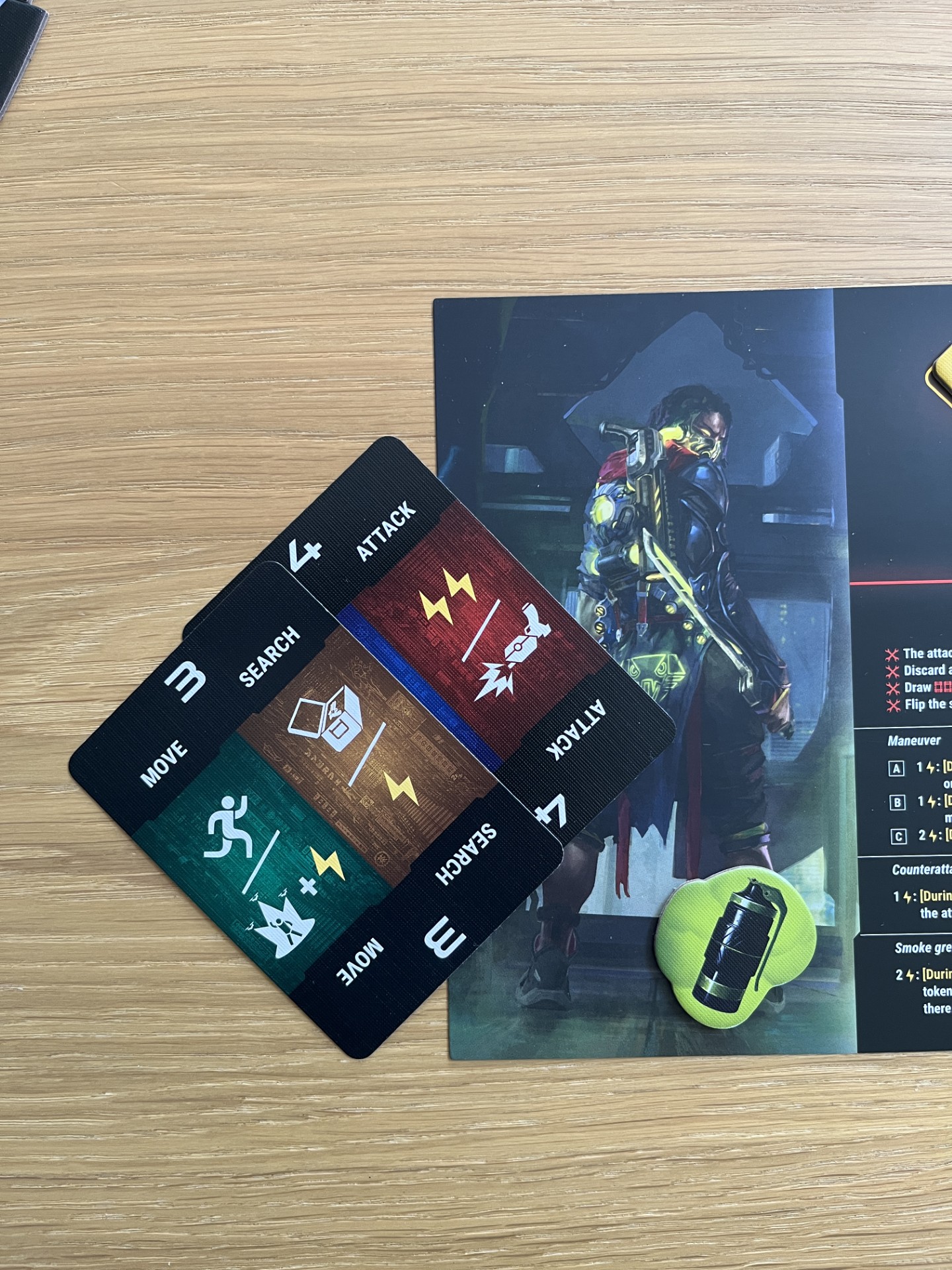 In Neon you will have your cyber fighter move, shoot, search, defend or gain energy. You do this by discarding cards with the corresponding symbol. You discard 2 cards (each with 2 types of actions) and you overlap the cards so that you perform 3, not 4, actions on your turn. Choose carefully so that you plan the ultimate service for you. Your turn does not always go as planned because the starting player changes depending on the number on your top card (of the 2 overlapping action cards). Sometimes it happens that you have planned to hit your enemy with one of your weapons, but due to the turn order it has moved out of your reach. It’s annoying when this happens, but it’s something you should try to take into account.