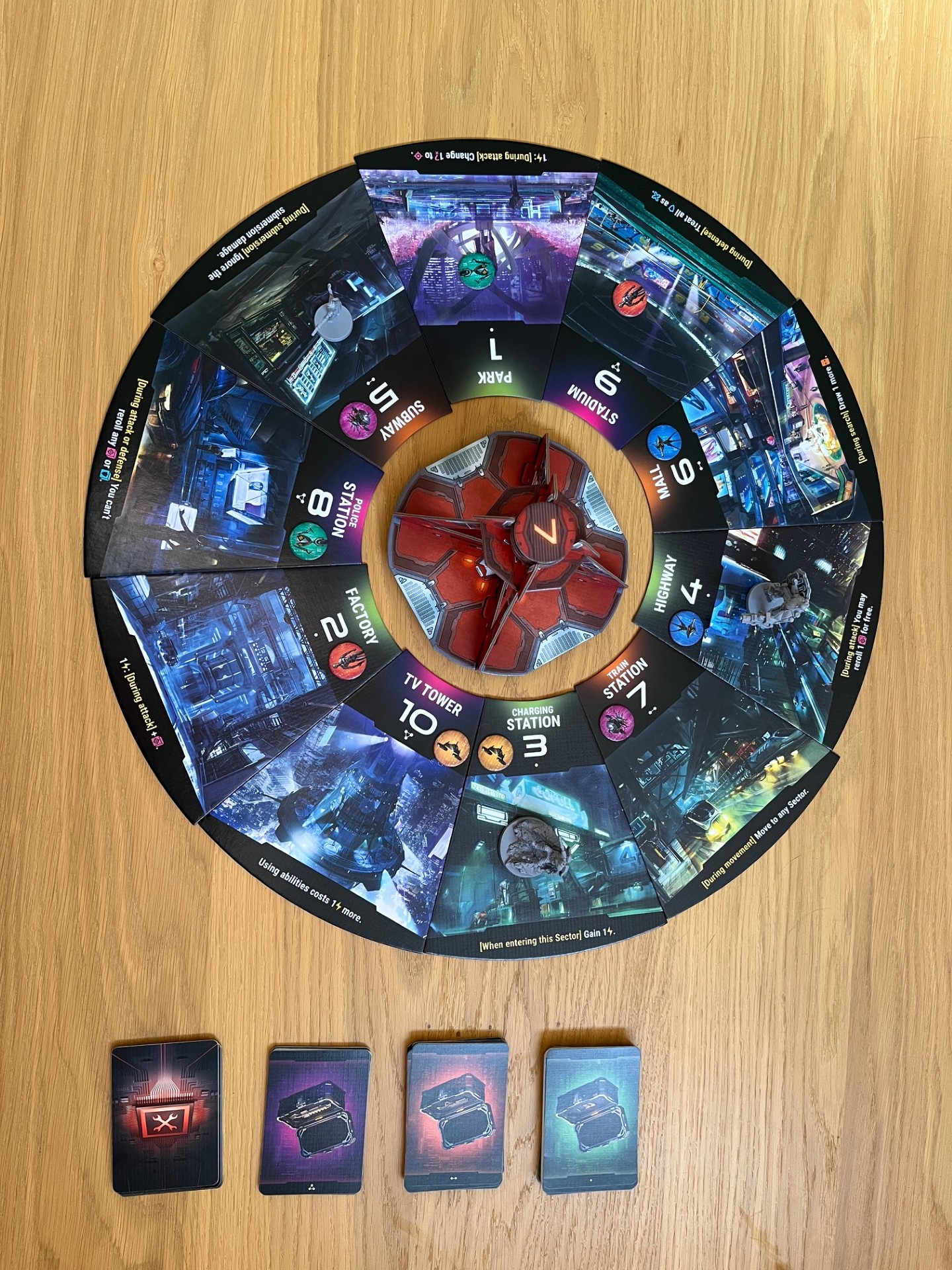 Na elke beurt vallen er 1 of 2 sectoren weg waardoor het gevechtsveld steeds kleiner wordt en je dus genoodzaakt wordt dichter bij je tegenstanders te komen.