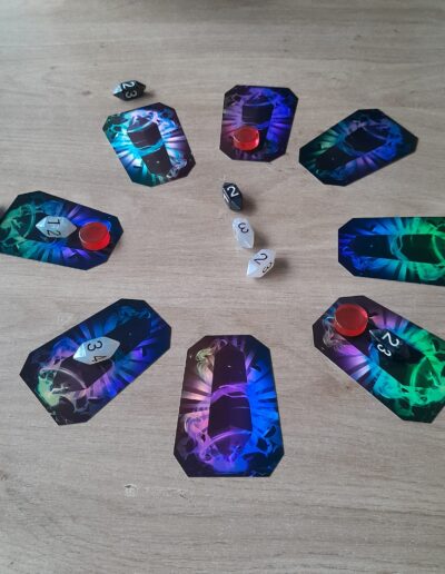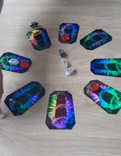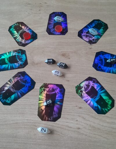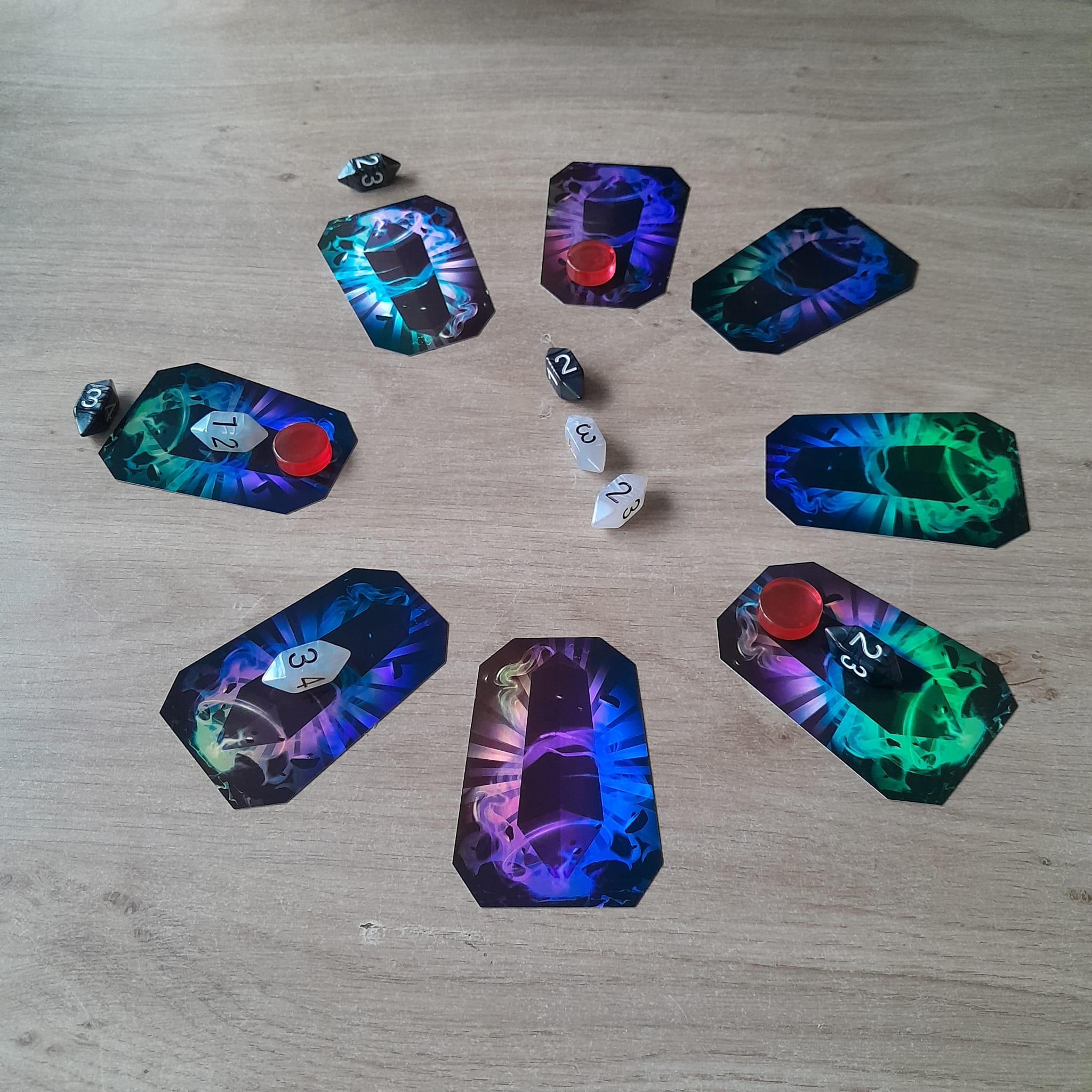 The setup of the game in quick and simple. You place the 8 conflux cards in a circle in the center of the table. On any card, you place a red “fraction token.