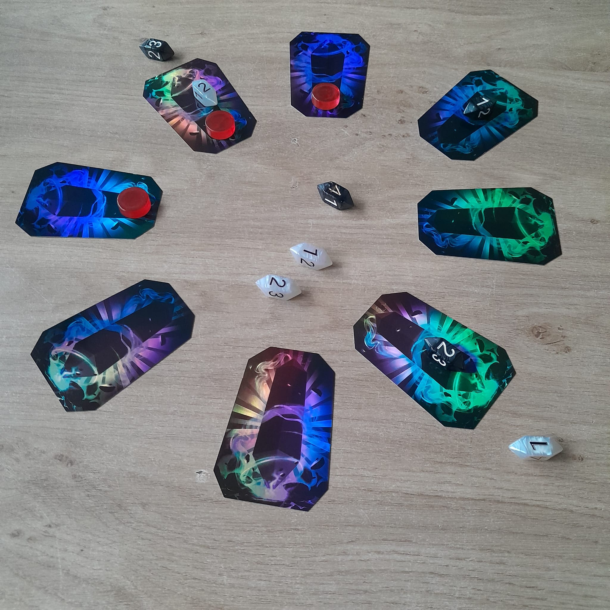De opzet van het spel in snel en simpel. Je legt de 8 conflux-kaarten in een cirkel in het midden van de tafel. Op een willekeurige kaart plaats je een rood ‘breuk-fiche’.