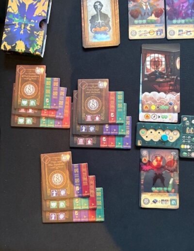 In solo mode, you play Unconscious Mind against Martha (Freud’s wife). The box includes various solo components such as cards, tiles, and overview cards. Martha plays with a standard player board and office, but without an insight board. You simply play according to the basic rules. Martha places speech bubbles on the conference table just like any other player, according to the positions on the solo cards. She also moves her inkwell according to the standard rules and takes bonuses that are slightly different. Martha exchanges many resources and other bonuses for therapy points to heal patients. For choices with multiple options, she uses an arrow that points to a choice. Martha plays smoothly and has three different levels. I have only played Unconscious Mind solo, and it feels very similar to the basic rules. It plays well.