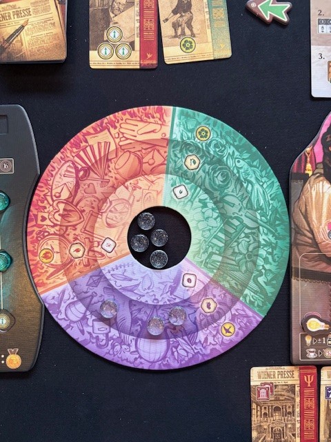 - Ideeën terugnemen. Dit is een reset fase die je doet als je geen tekstballonnen meer hebt en geen andere acties meer kan doen. Je krijgt dan je tekstballonnen terug. Je kan nu op de kaart van Wenen nog een bonus claimen.