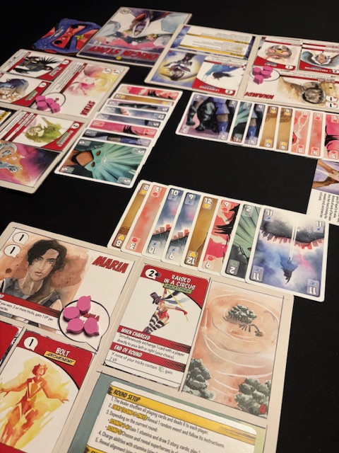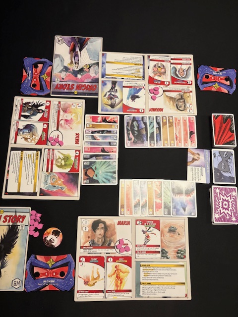 Origin Story is very similar to Rebel Princesses. Rebel Princesses is also a trick-taking game with effects (but with hearts) and I personally prefer it to Origin Story. This is because Rebel Princesses plays more smoothly for me; the effects are clearer and mostly consist of round effects that apply to every player. I think Origin Story plays more smoothly the more you play it, but unfortunately, I don’t have time for that.