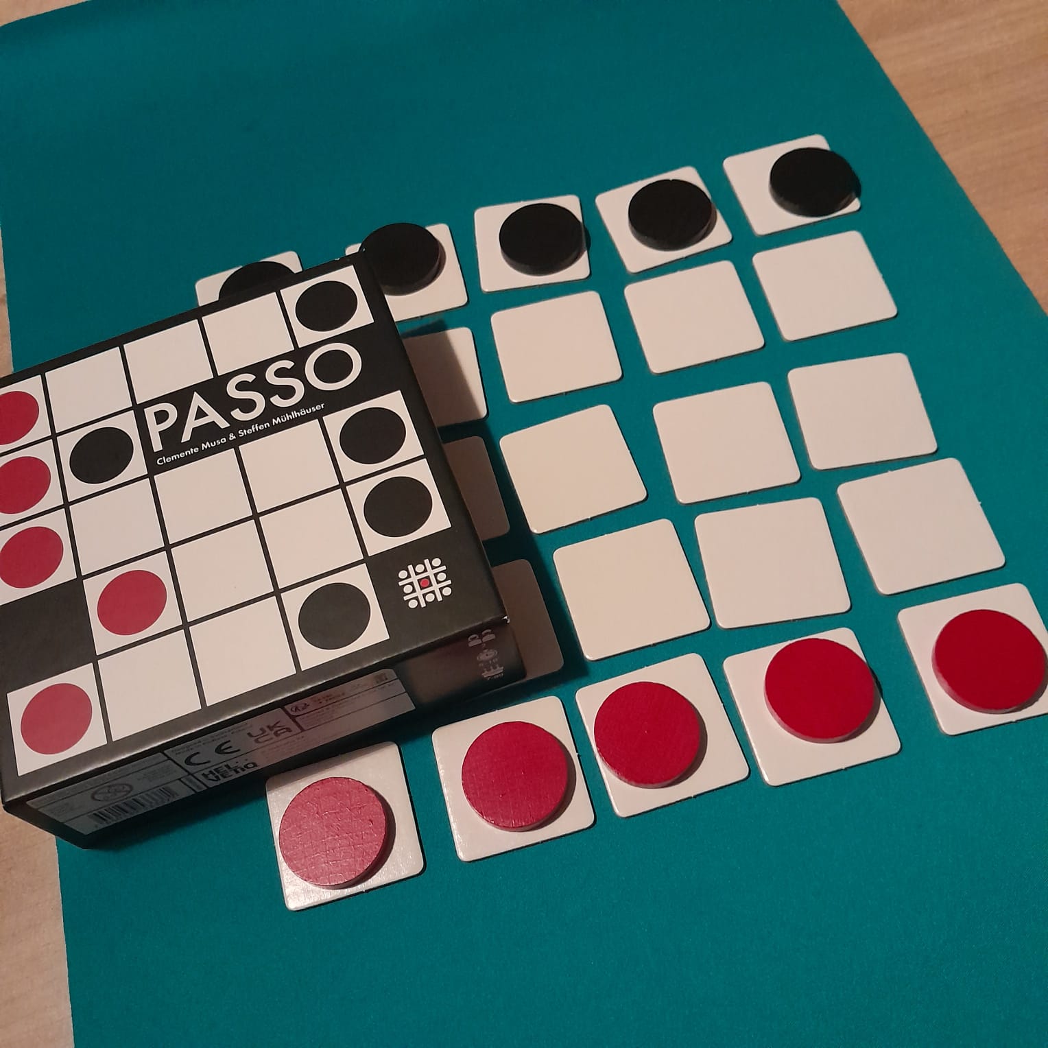 Passo zit een klein vierkant doosje. Zo’n formaat Regenwormen, prima formaat. In het doosje bevinden zich 25 witte tegeltjes, 5 rode en 5 zwarte schijven én 12 fiches, 6 van beide kleuren.