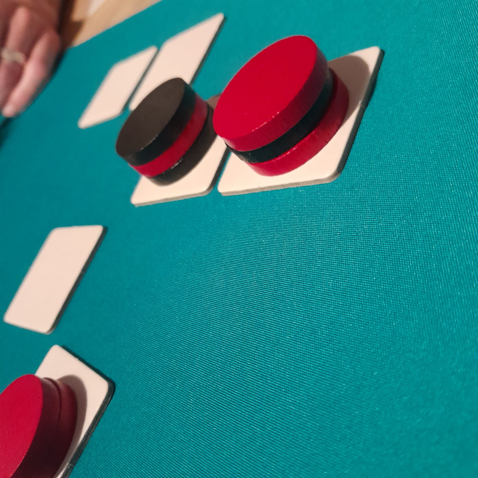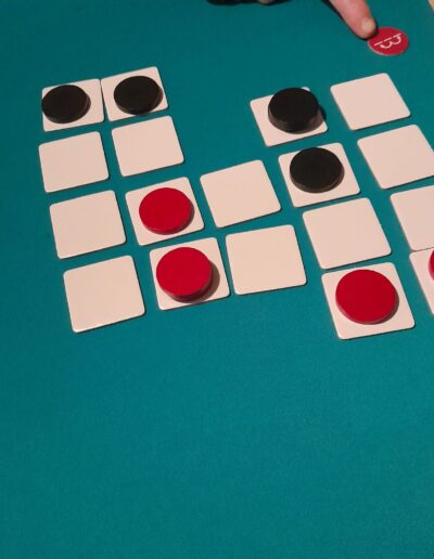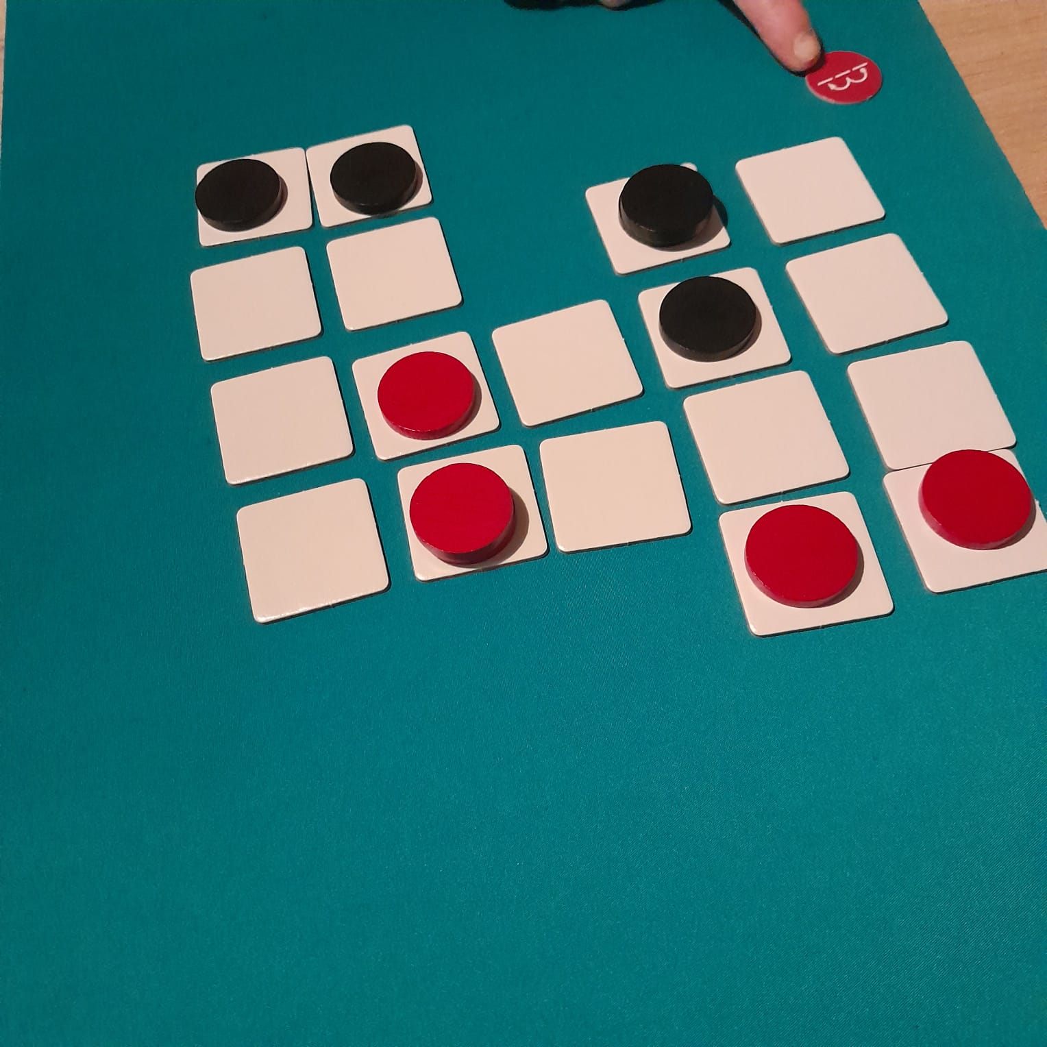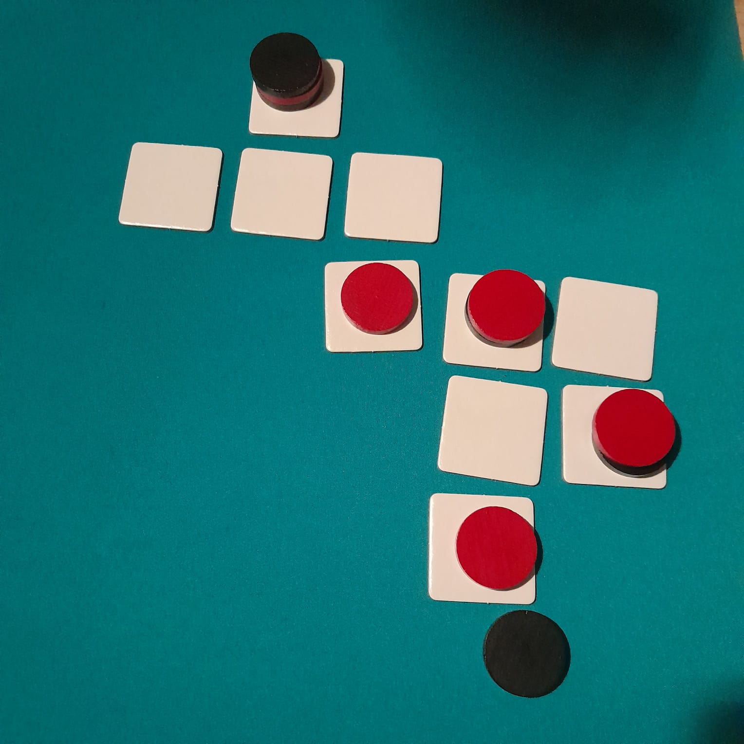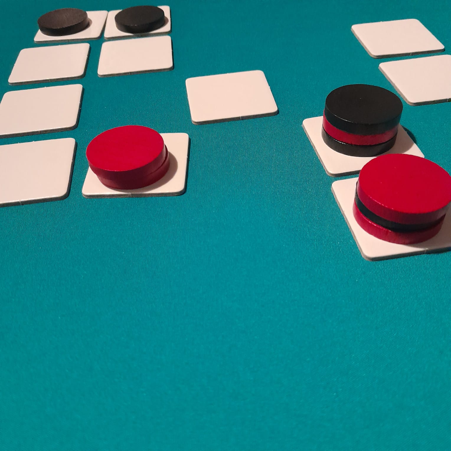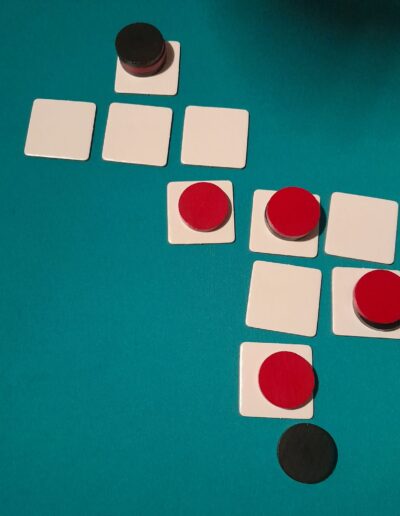 – Plaats een eerder verwijderde tegel terug in het veld en verplaats één van je schijven er naartoe.