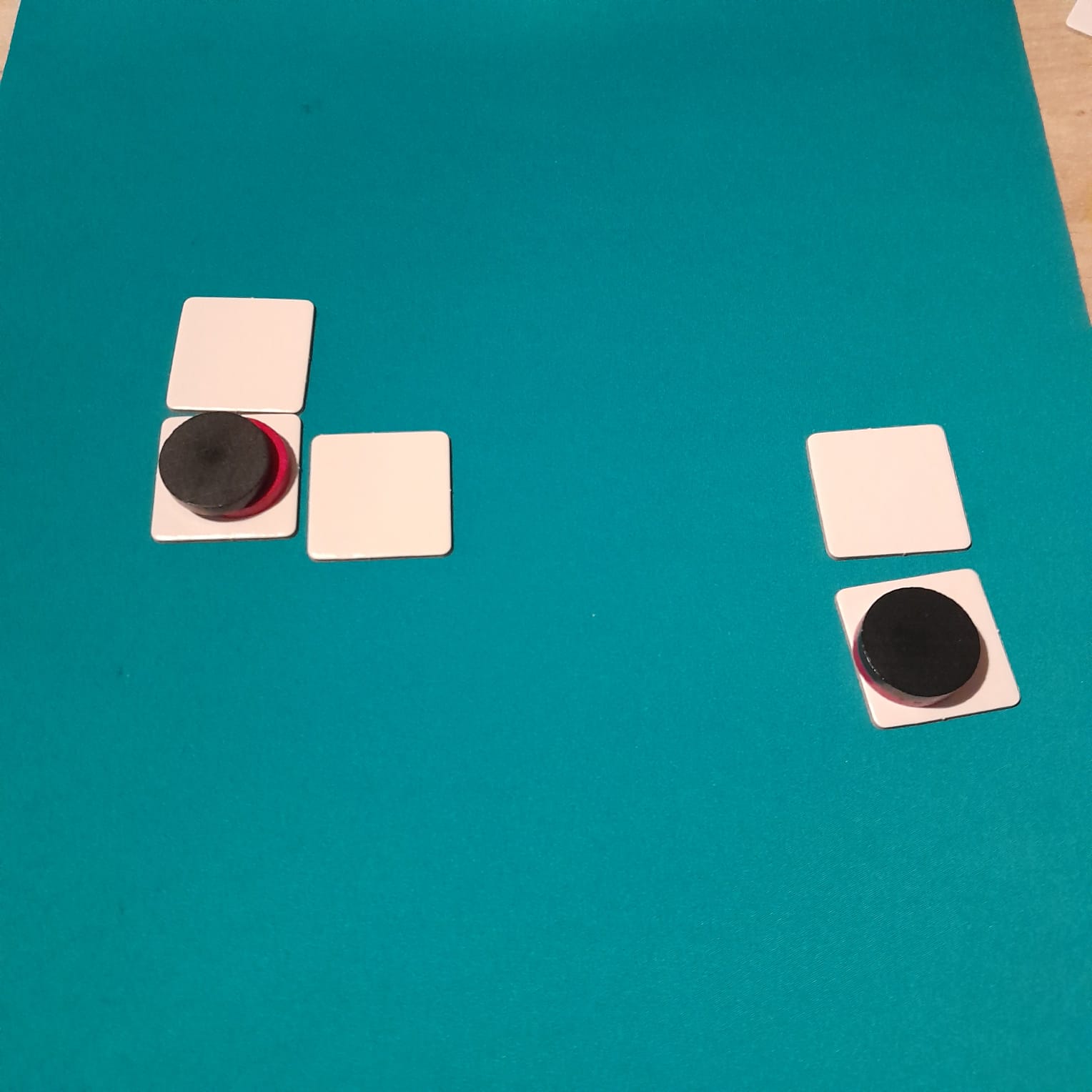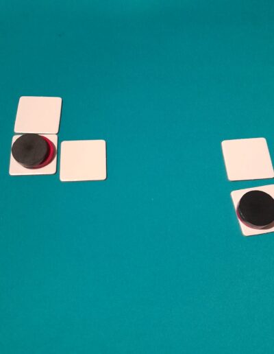 Leg de tegels neer zodat een 5×5 vierkant ontstaat. Plaats op de bovenste rij alle schijven van de ene kleur en op de onderste rij de schijven van de andere kleur.