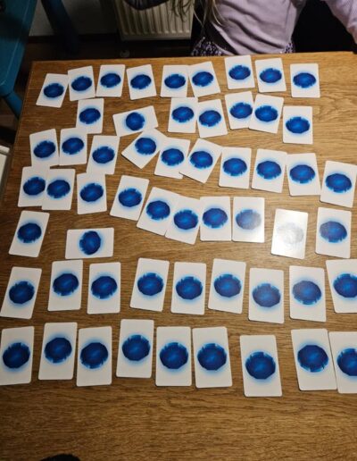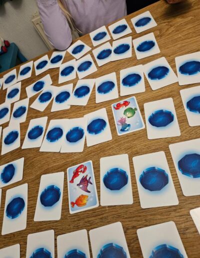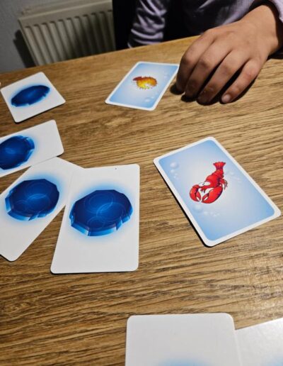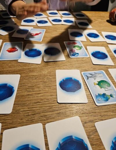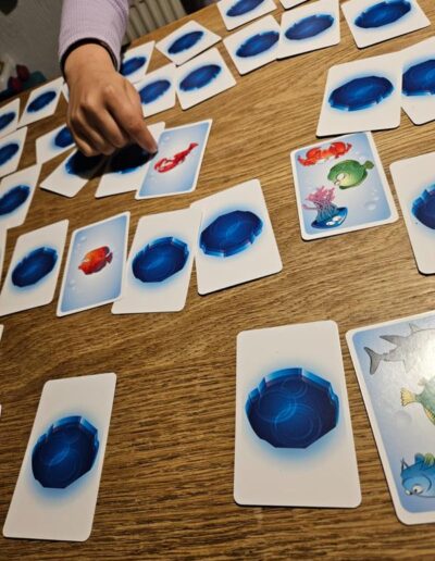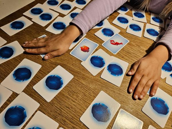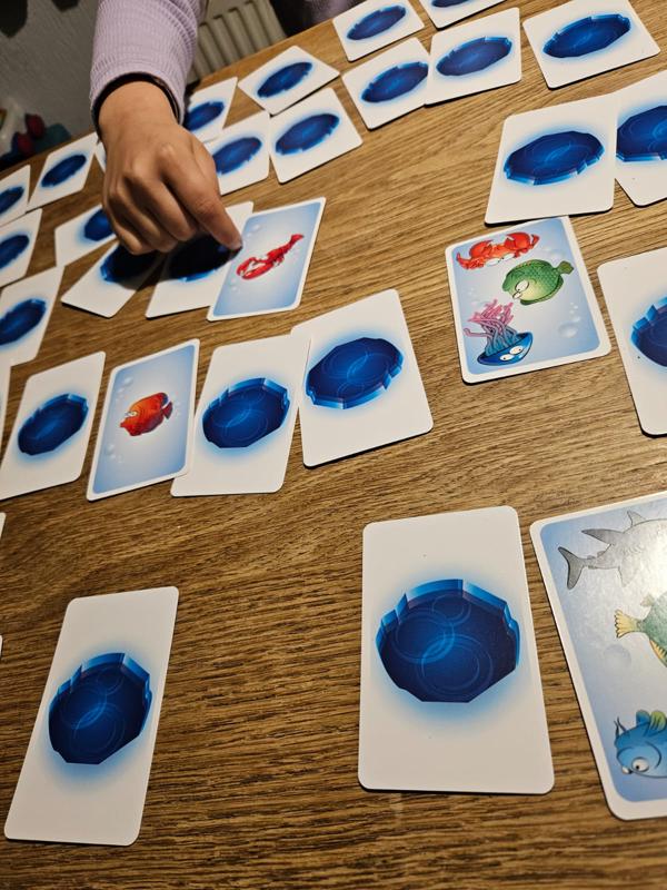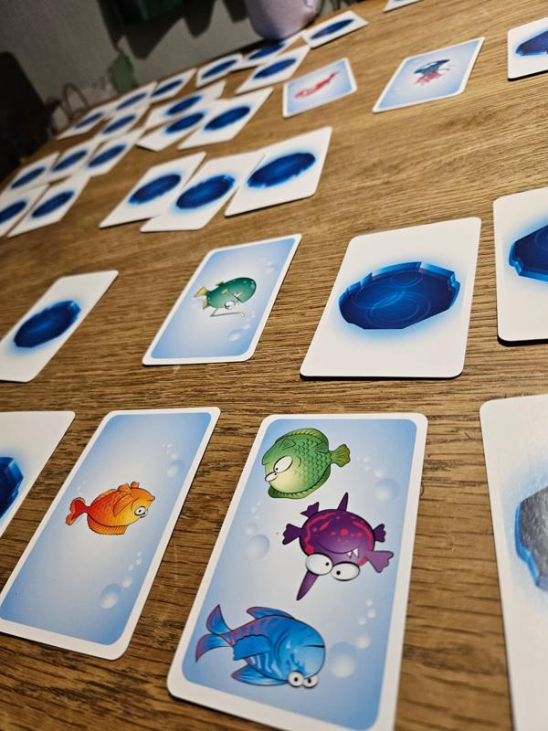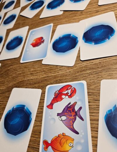 Now players take turns turning over a random card on the table. When a player sees two identical fish (on two different cards), they “slap” them and can keep the cards and place them on their personal pile. Unless they have misread the cards, in which case they must return one of the cards from their personal pile face down to the table.