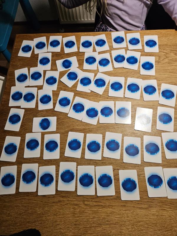 Alle kaarten uit het deck worden met de ijszijde naar boven op tafel verspreid. Let op; het zijn relatief veel kaarten dus je campingtafeltje is waarschijnlijk niet geschikt.