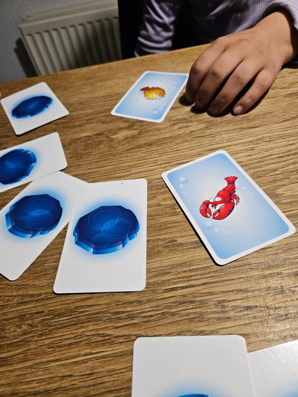 At first, I was a little overwhelmed by the amount of space Polar Panic took up on the table. I was especially afraid that Leonore (5.5) might not be able to ‘hit’ the cards on the other side of the table because her arms were too short. Fortunately, this turned out not to be the case. You could also choose to play with children on the coffee table, which is a little less wide.