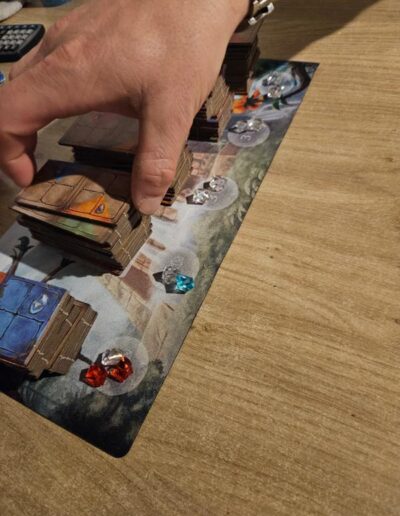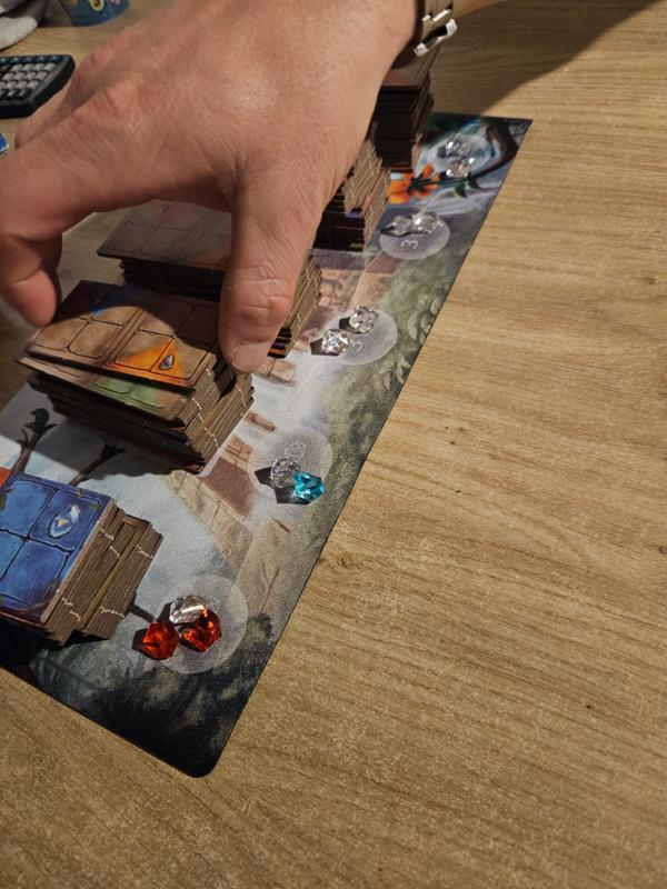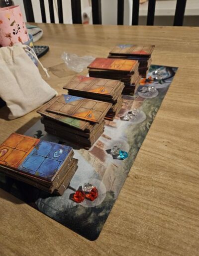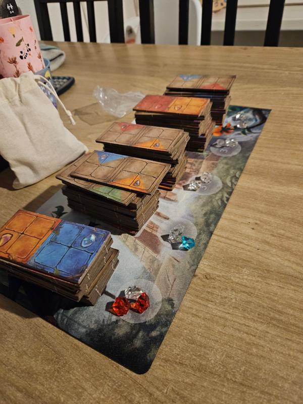 Alle domino’s worden geschud en ik gelijke stapels, gedekt, op de playmat gelegd. Bij elke stapel domino’s worden willekeurig 3 edelstenen geplaatst. Nu worden van 3 van de 5 stapels de bovenste domino’s opengedraaid zodat ze zichtbaar zijn.