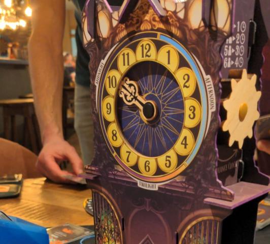Het spel wordt geleverd met een heuse Dice Tower-klok. Deze klok heeft een mechanisme dat de speelronde aangeeft. En omdat hij op een draaiend plateau staat is deze makkelijk te draaien naar de actieve speler. En als er een dobbelsteen moet worden gegooid, dan kan je die dus boven in de klok gooien.