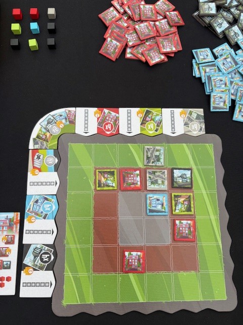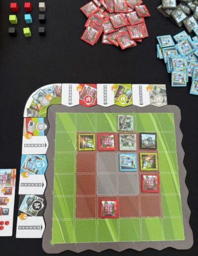 Je begrijpt dat dit een puzzeltje wordt. Er liggen aan je spelersbord nog kolom- en rij bonussen voor bijvoorbeeld 4 huizen in deze kolom, etc. Nog meer om rekening mee te houden.