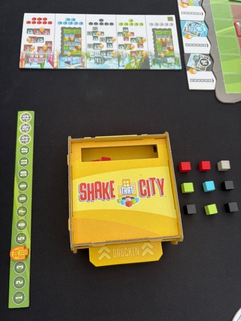 De eerste keer moet je even de tijd nemen om de Cube Shaker in elkaar te zetten. De Shaker werkt verder verassend goed. Het spel bestaat uit veel gebouwtegels, gekleurde blokjes, spelersborden en natuurlijk de Cube Shaker. Voor de opzet leg je je spelersbord voor je neer op de makkelijke zijde of moeilijke zijde. Leg aan de rand van je spelersbord de kolom- en rijtegels. De voorraad tegels: huizen, fabrieken, parken, wegen en winkels leg je op een makkelijke plek op tafel zodat iedereen erbij kan. Leg het rondespoor op tafel en je kan beginnen. Shake That City bestaat uit 15 ronden.