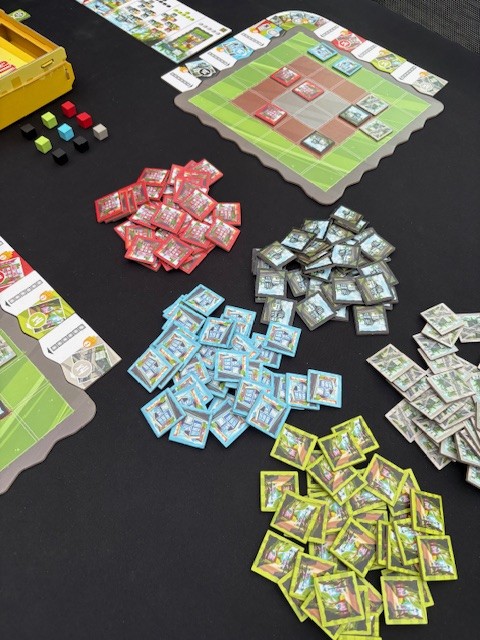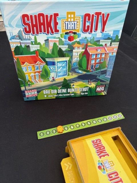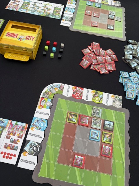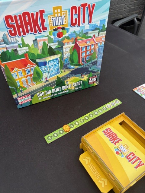 Honestly, Shake That City pleasantly surprised me. I’ve played quite a few games with tiles on your own board and had gotten a bit tired of it lately. Shake That City is very short and moves quickly because everyone plays simultaneously. 15 rounds sounds like a lot, but a round only consists of laying a few tiles. The puzzle of how to lay everything out perfectly, which of course isn’t completely successful, has more depth than I initially anticipated, especially if you also want to score well for the column and row bonuses. The difficulty rating, according to BoardGameGeek, is 1.89. This is low. This is often based on the rules, and they are indeed easy. After a few plays, you’ll know exactly what the buildings do. But to score a lot of points, the difficulty is a bit higher. This is reflected in the age range of 10+. It can be played younger, but the score will decrease. This is exactly the same as with another tile-laying game, Cascadia (difficulty 1.85 and also 10+).