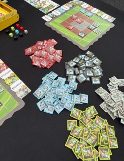 Eerlijk gezegd, heeft Shake That City me aangenaam verrast. Ik heb redelijk wat spellen gespeeld met tegels op je eigen bordje en was er de laatste tijd wel wat op uitgekeken. Shake That City duurt erg kort en gaat snel omdat iedereen gelijktijdig speelt. 15 ronden klinkt veel, maar een ronde bestaat alleen maar uit een paar tegels leggen. De puzzel om alles ideaal neer te leggen, wat uiteraard niet volledig lukt, heeft meer diepgang dan ik vooraf dacht. Zeker als je ook nog de kolom- en rijbonussen goed wil scoren. De moeilijkheid volgens BoardGameGeek is 1.89 Dit is laag. Dat wordt vaak ingedeeld op basis van de regels en die zijn ook makkelijk. Na paar keer spelen weet je precies wat de gebouwen doen. Maar om veel punten te halen, is de moeilijkheid toch wel iets hoger. Dit zie je terug in de leeftijd van 10+. Het kan jonger maar aantal punten zullen dan dalen. Dit is precies hetzelfde als met een ander tegellegspel Cascadia (moeilijkheid 1.85 en ook 10+).