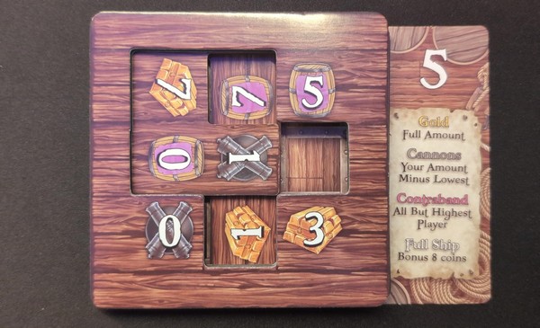 Als je niets meer van het ruim kan zien, dus de papieren kaart die onderop ligt, dan is je schip vol en krijg je 8 munten extra!