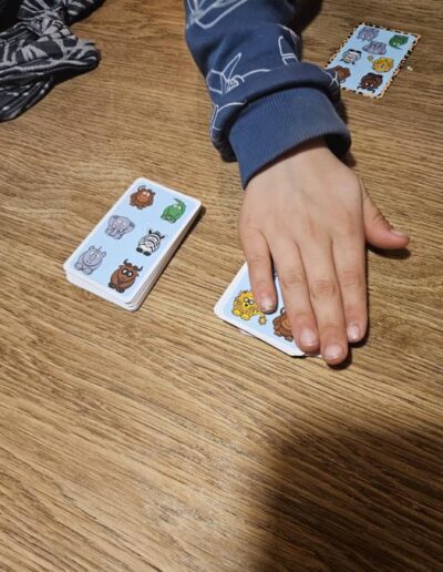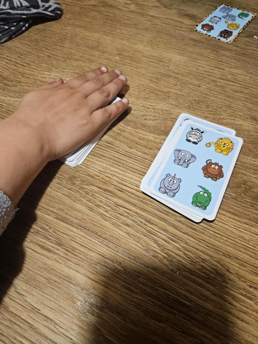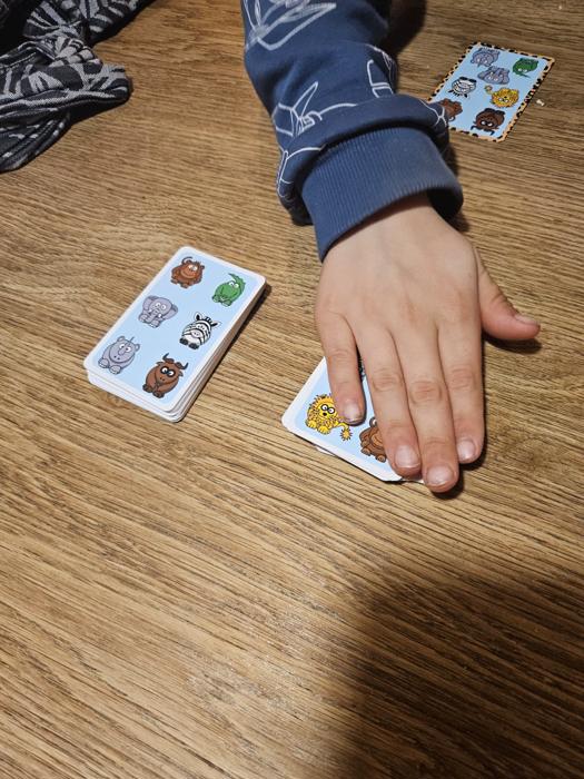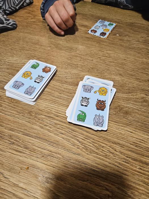 Each card shows 6 or 11 animals. The reference card shows 7 or 12 animals, respectively. Now it’s up to the players to quickly figure out which animal is missing. The first player to give the correct answer gets to take the card. Both piles are played simultaneously.