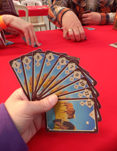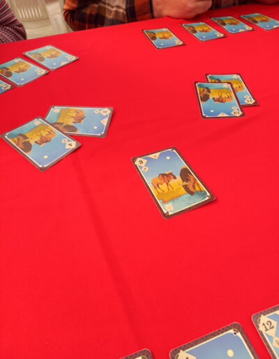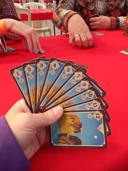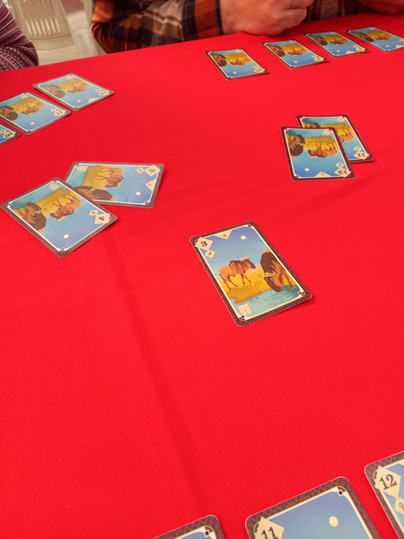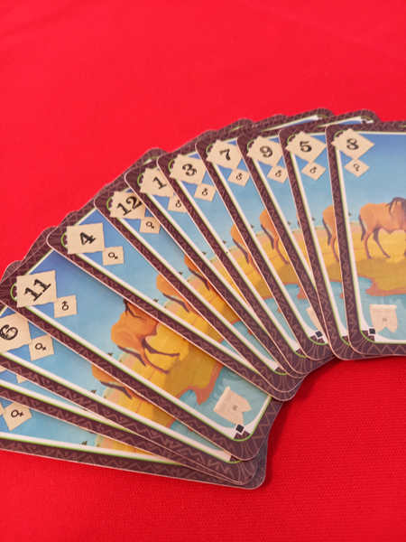 Personally, I find the artwork a little less successful. Every wildebeest card looks the same, except for a different coloured border. It would have been more interesting to depict a small calf on the card with the number 1 and an old, retired wildebeest on the card with the number 12, for example. Another big mistake is that the numbers are only on the left side of the cards. Too bad for you if you normally hold your cards differently! The publisher has told me that this flaw will be corrected in a future version/print. Personally, I think it’s a beginner’s mistake, and I find it strange that it wasn’t noticed during the test games that normally precede a game’s publication. All in all, I think it’s a very nice game, but I’m not sure yet whether I want to play it often with my husband. He’s very good at remembering who played which wildebeests, which is not my strongest point!
