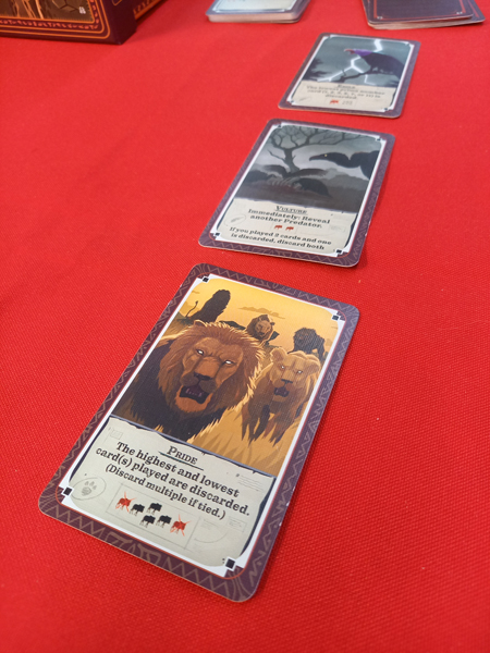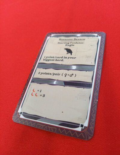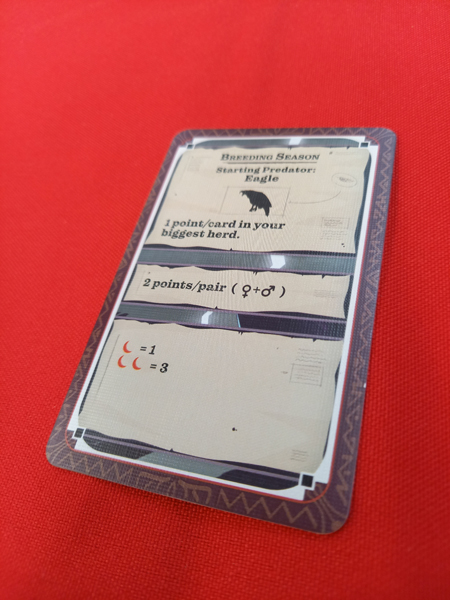 Predator cards: The first predator card to be turned over is determined by the season card in this game. After that, one predator is added each round. A predator remains active until it has caught at least 1 wildebeest. This predator is then no longer hungry and disappears from the game.