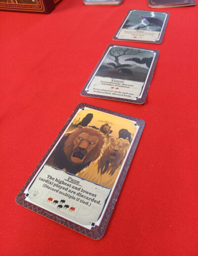 Now the effect of the predators is checked from left to right in the predator row. The effect of the predator that has been there the longest is therefore carried out first. This is followed by the more recent predators. Wildebeests that are captured are placed on the discard pile. Wildebeests that safely reach the other side are placed on the individual score piles of the various players. Predators that have managed to capture a wildebeest disappear from the row. The remaining predators form the new row. Next, another predator card is turned over and the next round can begin. The game ends when everyone has played all their cards. It is possible that this will not happen in the same round for all players.