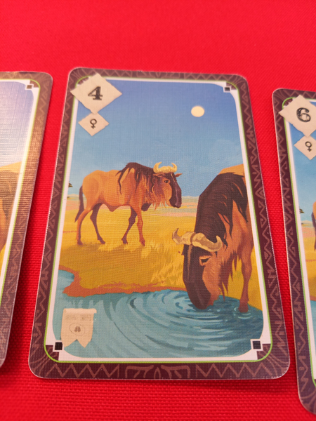 At the end of the game, all players place their safe wildebeests in order from low to high on the table in front of them. Based on the season card that was turned over at the beginning of the game, you now check how many points you have scored. The player with the most points wins the game!
