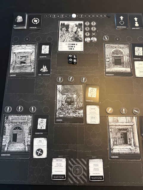 The game consists of laying out the main board and player boards. The main board features various locations, and each location contains several types of cards. A player board doesn’t hold much: two weapons and a few cubes for indicating health and abilities. The setup is average and not suitable for a small table.